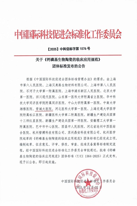 作为中国国际科技促进会直属职能部门,该标委会是依据《中华人民共和国标准化法》等规定,在国家相关管理部门备案成立的标准化专业服务机构。其核心宗旨是通过标准化、国际化推动新技术与新服务落地,实现我国标准体系与国际接轨,已建立涵盖标准立项、审查、推广、复审等全流程的二十项管理制度,所发布标准兼具科学性与行业指导价值。此次《钙磷基生物陶瓷的临床应用规范》的发布,正是该标委会服务医疗行业标准化发展的重要实践。